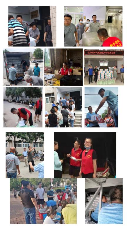 7月28日下午5:30市防汛指挥部召开紧急会议,我校为新增安置点。按照校党委的指示,7月29日,为充分配合学校做好接收卫辉老乡的临时安置工作,生命科学与基础医学学院党委迅速行动,在党委书记田涛和院长陈磊山的带领下,迅速成立了20余人的突击小队。自7月29日凌晨开始,党委书记田涛、院长陈磊山、副书记原玉丰、副院长郭晖、蒿宝珍、郜皓、楚莉莉等人已积极投入到接收卫辉老乡的临时安置工作志愿者行动中,帮助接被安置人员,搬运生活用品等工作,一直奋战到早上5点左右才回家休息。7月29日上午9点,仅仅休息3个小时左右后又重新回到救灾一线,郭晖、楚莉莉回到受灾群众安置点进行物资发放等工作。党委书记田涛和院长陈磊山带领学院岳锋、蒿宝珍、郭东光、田金河、赵现方、许飞、朱光超、于涛、张家洋、姜晓杰等搬运物资,物资搬运完后陈磊山等迅速前往卫辉老乡安置点A02,D01和D02等进行生活物质的搬运和发放等工作。孙国鹏主任虽然腿部有伤,但仍带伤坚持和大家一起奋战。