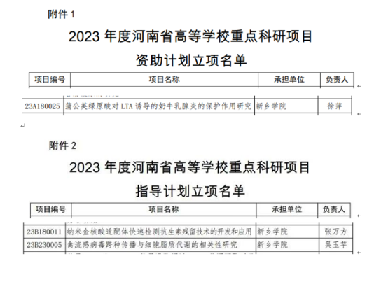 近日,河南省教育厅发布了《河南省教育厅关于2023年度河南省高等学校重点科研项目计划立项的通知》,我院申报的三个项目均获得立项。其中徐萍主持申报的“蒲公英绿原酸对LTA诱导的奶牛乳腺炎的保护作用研究”获资助计划立项,吴玉苹主持申报的“禽流感病毒跨种传播与细胞脂质代谢的相关性研究”和张万方主持申报“纳米金核酸适配体快速检测抗生素残留技术的开发和应用” 获指导计划立项。