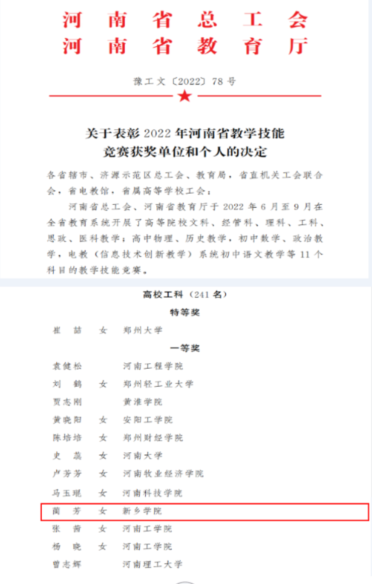 近日,从河南省总工会、河南省教育厅联合下发的《关于表彰2022年河南省教学技能竞赛获奖单位和个人的决定》(豫工文〔2022〕78号)中获悉,我院蔺芳老师获得此次大赛一等奖,并被授予“河南省教学标兵”称号。