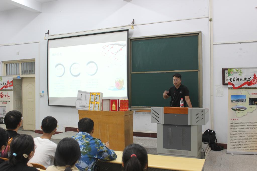 首先,赵利波总监为新生作了精彩讲座,介绍了河南寿酒集团的发展历程,并结合自己的工作经历和感受,深入浅出地阐述了白酒文化发展历史、酿酒工程行业的现状、发展趋势、市场需求等。他表示近些年随着人民生活水平的提高,酿酒相关行业对于人才的需求不断增加,这也为酿酒工程等相关专业的毕业生提供了广阔的就业前景。