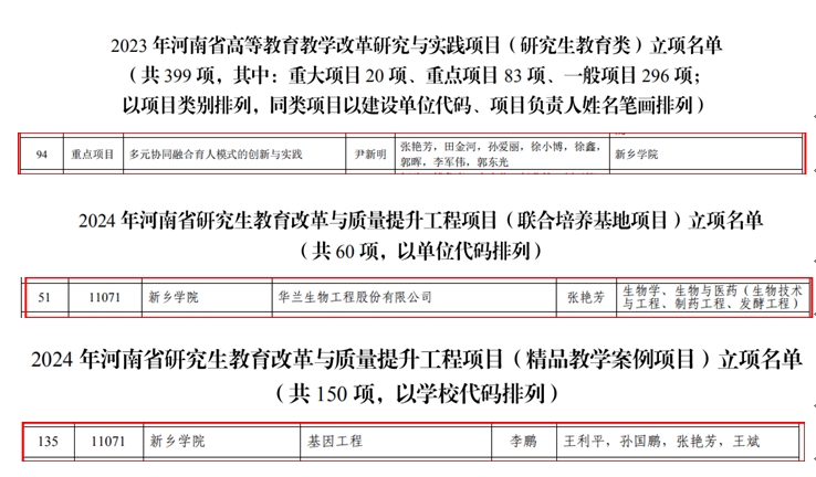 近日,河南省教育厅下发《关于公布2023年河南省高等教育教学改革研究与实践项目(研究生教育类)立项名单的通知》(教研〔2023〕435号)、《关于公布2024年河南省研究生教育改革与质量提升工程项目立项名单的通知》(教研〔2023〕436号),太阳集团tyc539MACAU获批2023年省级高等教育教学改革研究与实践项目(研究生教育类)重点项目1项;获批2024年省级研究生教育改革与质量提升工程项目2项,其中联合培养基地项目1项、精品教学案例项目1项。以上项目的获批,对于推动学院研究生教育科学研究、积累专业学位研究生培养经验,全面提升研究生培养质量奠定了坚实的基础。