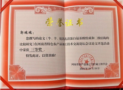 大会还举行了征文活动,在河南省特色农产品加工技术交流论坛会议论文评选活动中,郭瑞瑞的参赛论文在同行中脱颖而出,获得三等奖,这也是我院首次在省级同行单位中荣获该奖项,标志着我院在科研水平和学术影响力上迈上了新的台阶。此外,参会教师与众多食品科学领域专家学者进行了深入交流和讨论,促进学术思想的碰撞与融合,获知农产品加工的新发展趋势和需求,进一步提升自己的学术水平,增强科研信心。通过本次的交流学习,拓宽了教师学术视野、建立了学术网络、为学院的学科建设和科研发展创造提供了新的思路。