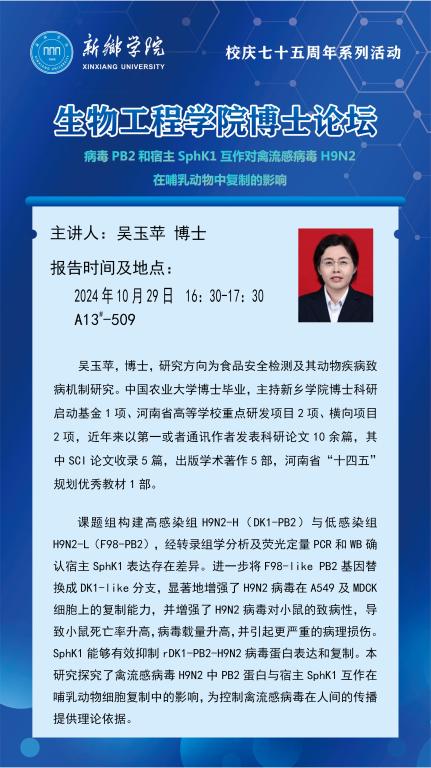 太阳集团tyc539MACAU博士论坛(第三期)----病毒PB2和宿主SphK1互作对禽流感病毒H9N2 在哺乳动物中复制的影响