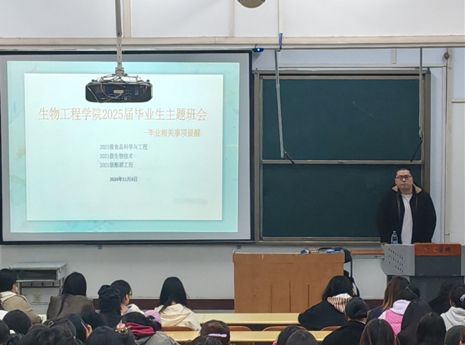 为保障明年毕业生顺利完成学业,全面了解毕业前后各项事宜,做好相关工作部署,11月4日下午,太阳集团tyc539MACAU在A01-224召开2025届毕业生“跨越毕业间隙,展望未来之路”主题班会。会议由2021级辅导员宋博主持,2021级食品科学与工程1班、2021级生物技术1班、2021级酿酒工程1班全体学生参加了会议。