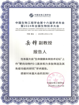 大会以“创新与跨越,构建生物经济新格局”为主题,探讨生物工程领域的最新进展、面临的挑战以及未来的发展趋势,促进生物工程领域交流与合作,推动生物技术的突破性创新,加速生物经济时代的到来,为全球经济的可持续发展注入新的活力。我院岳锋博士在大会分论坛作了题为“靶向动物PD-1高亲和力多肽筛选及其免疫功能的研究”,和与会专家就动物新型疫苗和生物制品研发进行了深入的交流和探讨。