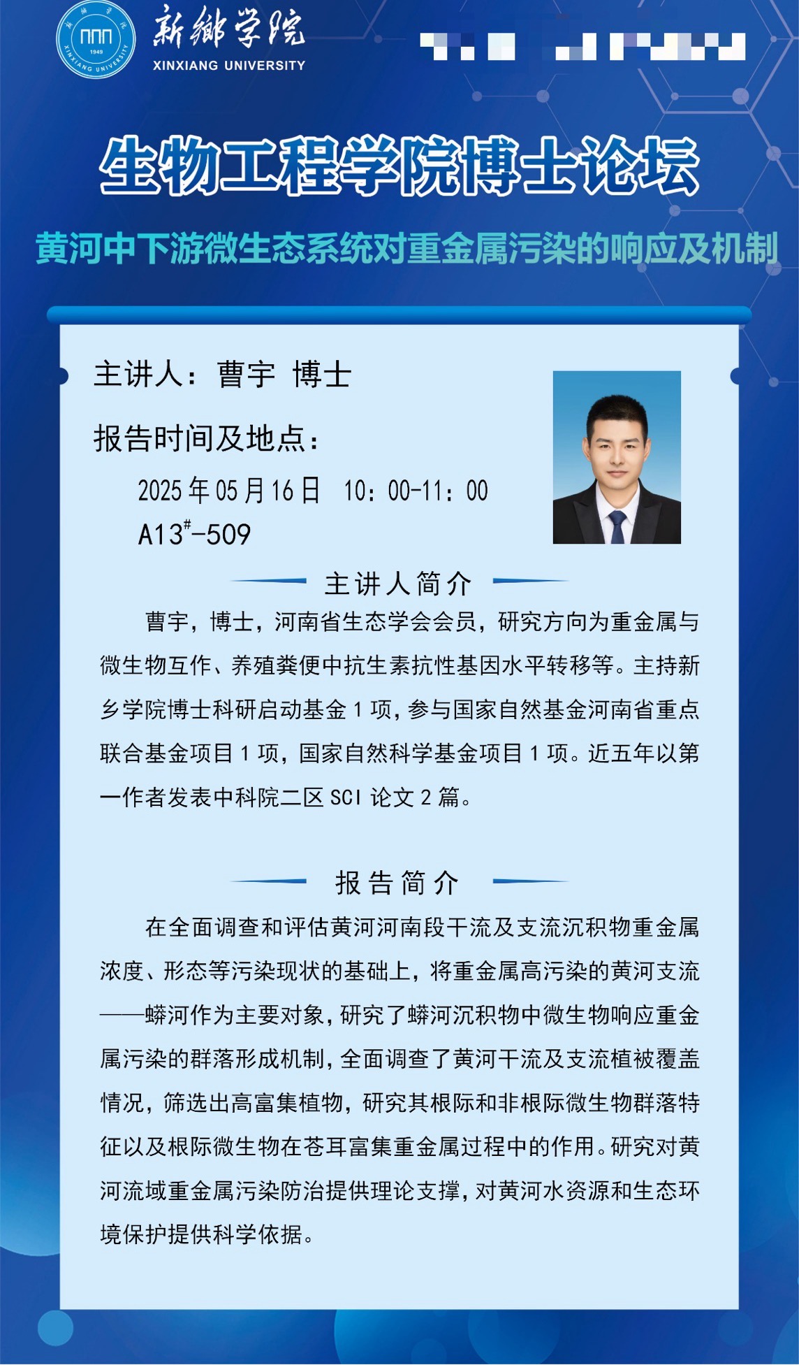 太阳集团tyc539MACAU博士论坛预告(第五期)-----黄河中下游微生态系统对重金属污染的响应及机制