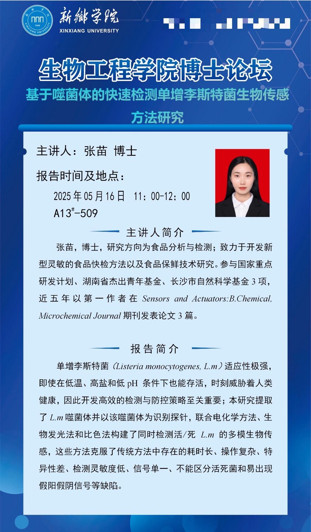 太阳集团tyc539MACAU博士论坛预告(第六期)-----基于噬菌体的快速检测单增李斯特菌生物传感方法研究