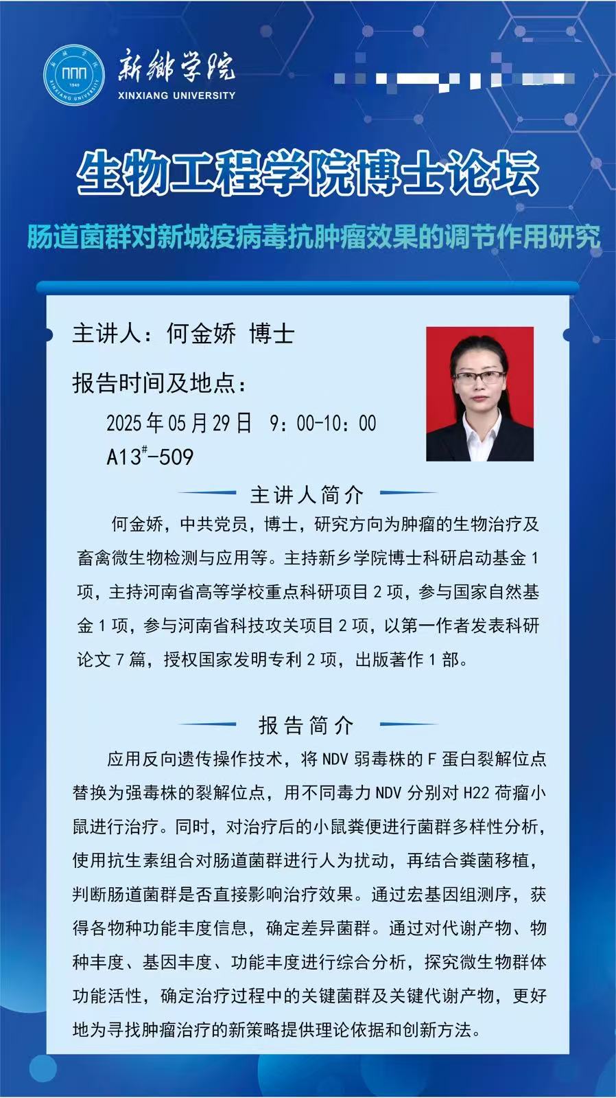 太阳集团tyc539MACAU博士论坛预告(第七期)-----肠道菌群对新城疫病毒抗肿瘤效果的调节作用研究