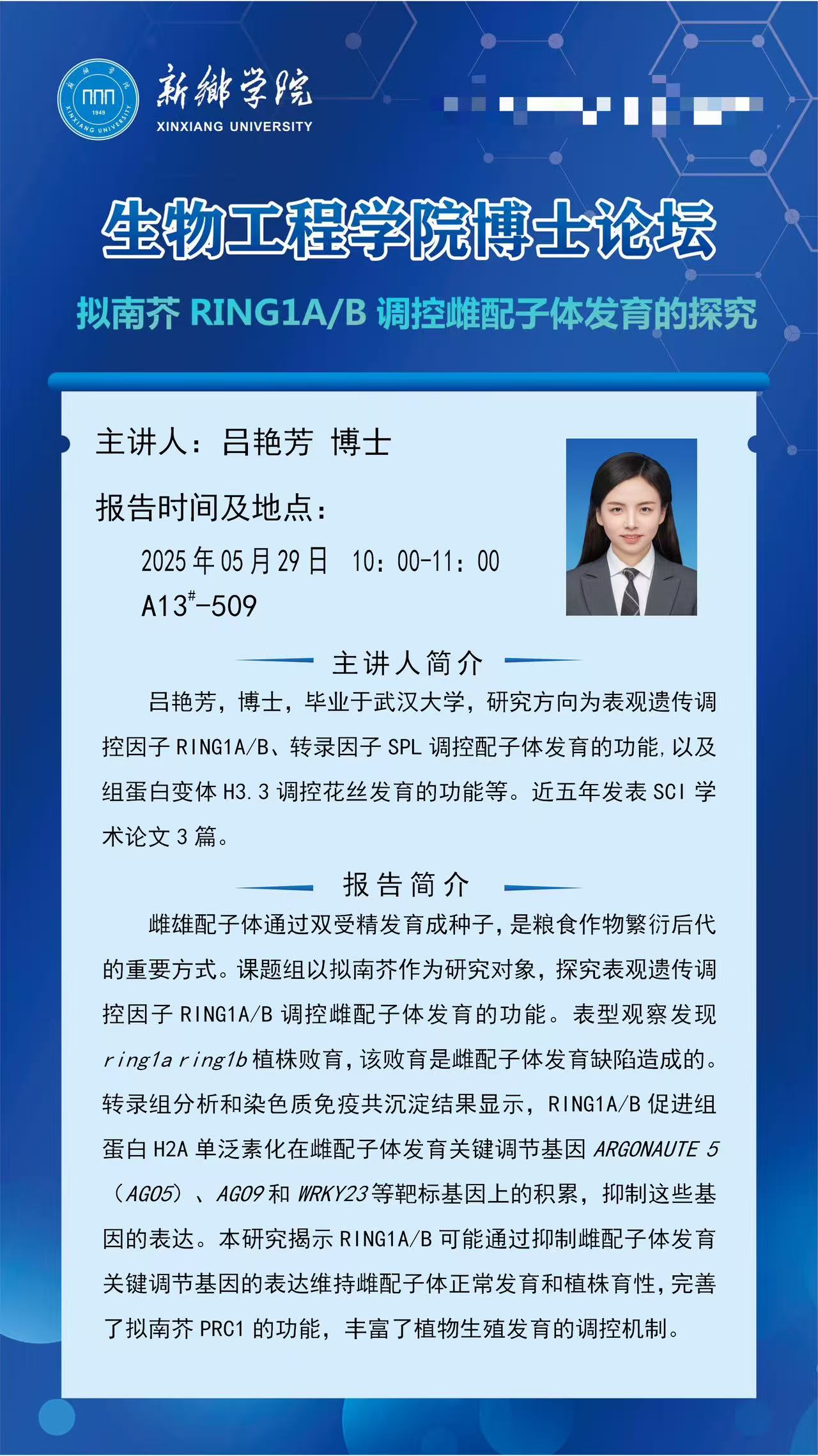 太阳集团tyc539MACAU博士论坛预告(第八期)-----拟南芥RING1A/B调控雌配子体发育的探究