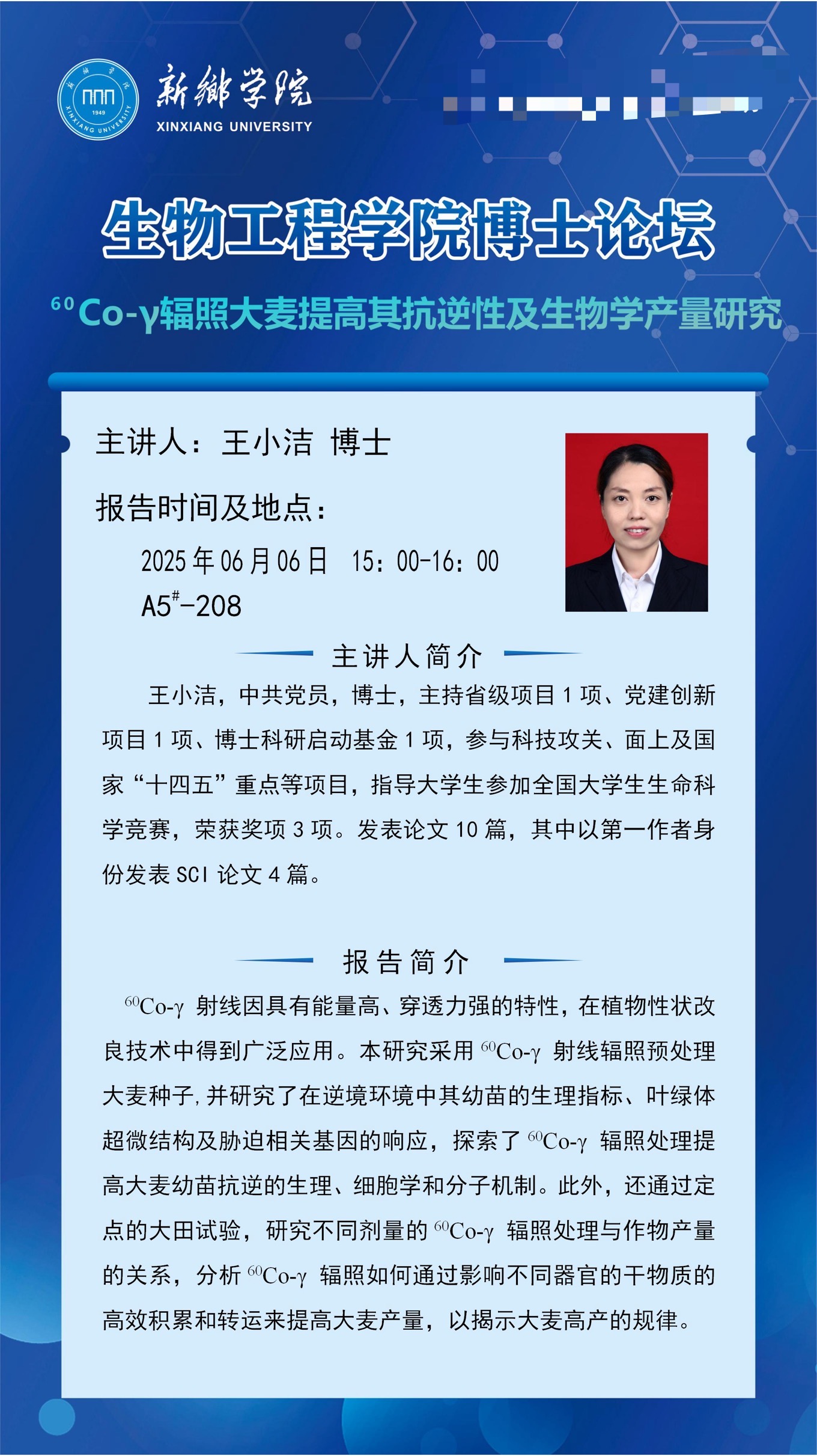 太阳集团tyc539MACAU博士论坛预告(第九期)-----60Co-γ辐照大麦提高其抗逆性及生物学产量研究