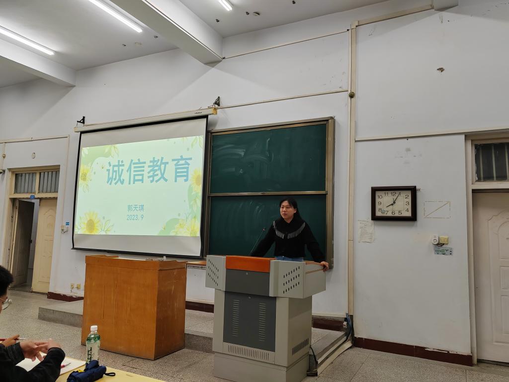 会议伊始,郭天琪以“什么是诚信廉洁”为题,引出此次活动的主题。她围绕大学生诚信廉洁,从廉洁和诚信的概念解释出发,通过列举鲜活的例子让同学们深刻理解二者相互联系、相互包容的关系,勉励同学们成为一个诚信廉洁的人。接着,她深入浅出地介绍了诚信考试以及学校的处罚政策,强调考试要注重诚信,号召同学们认真学习、查漏补缺、诚信考试。最后,她指出诚信廉洁的利处及对个人发展的积极影响,使同学们了解了诚信廉洁的意义,培养了学生廉洁自律的观念。