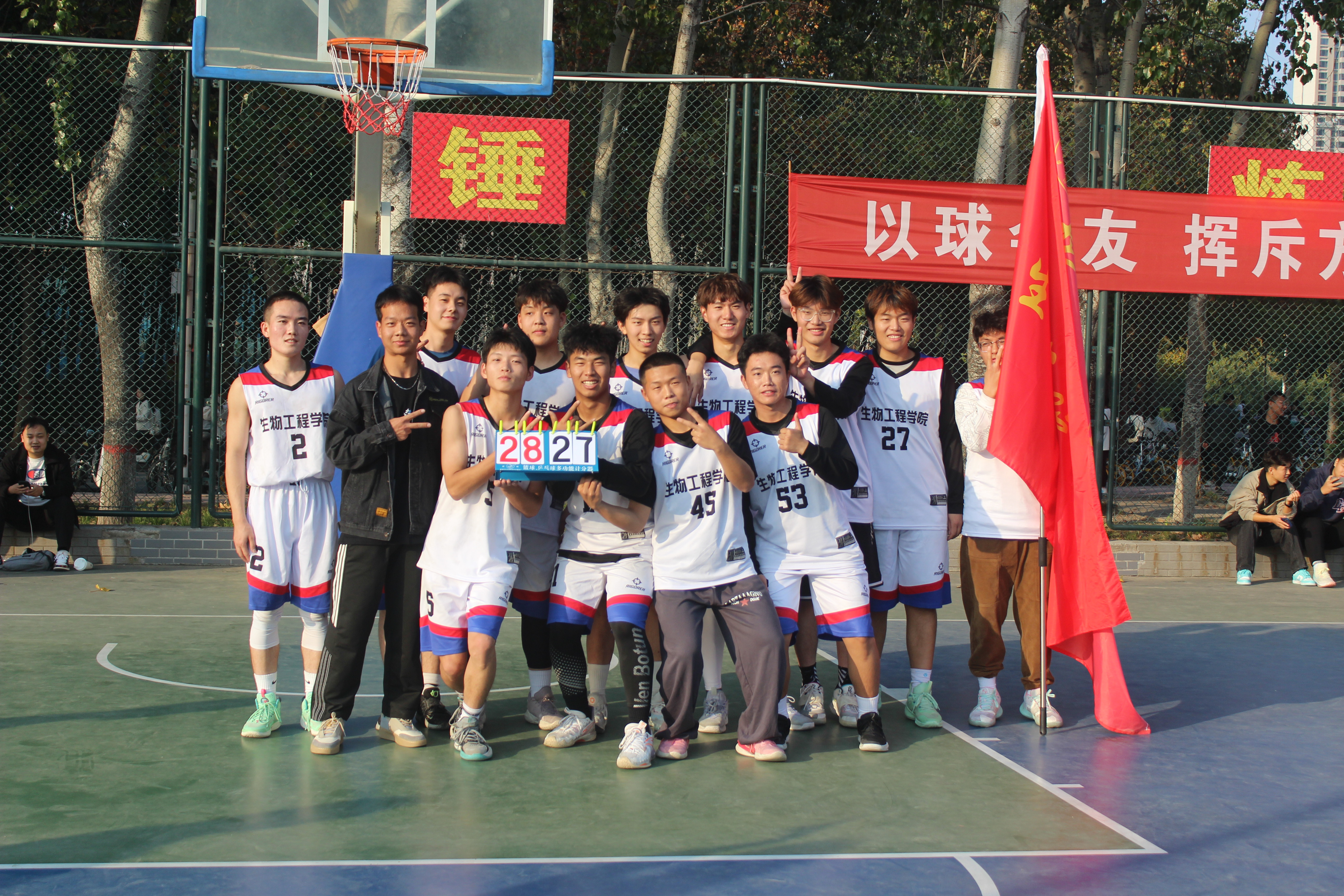 比赛开始前,球员们聚集在一起讨论战术,互相加油打气。哨声吹响,比赛正式拉开帷幕,我方队员在场上积极奔跑传球,寻找时机进攻,场下同学们加油呐喊,热情助威。比赛中,队员们发挥顽强拼搏的精神,无论比分是领先还是落后,每球必争,决不放弃。在比赛的后半程,我方队员找到自己的节奏,循序渐进,寻求突破机会,队员之间配合默契,运球,传球,投篮一气呵成,最终以28:27的比分获得胜利。