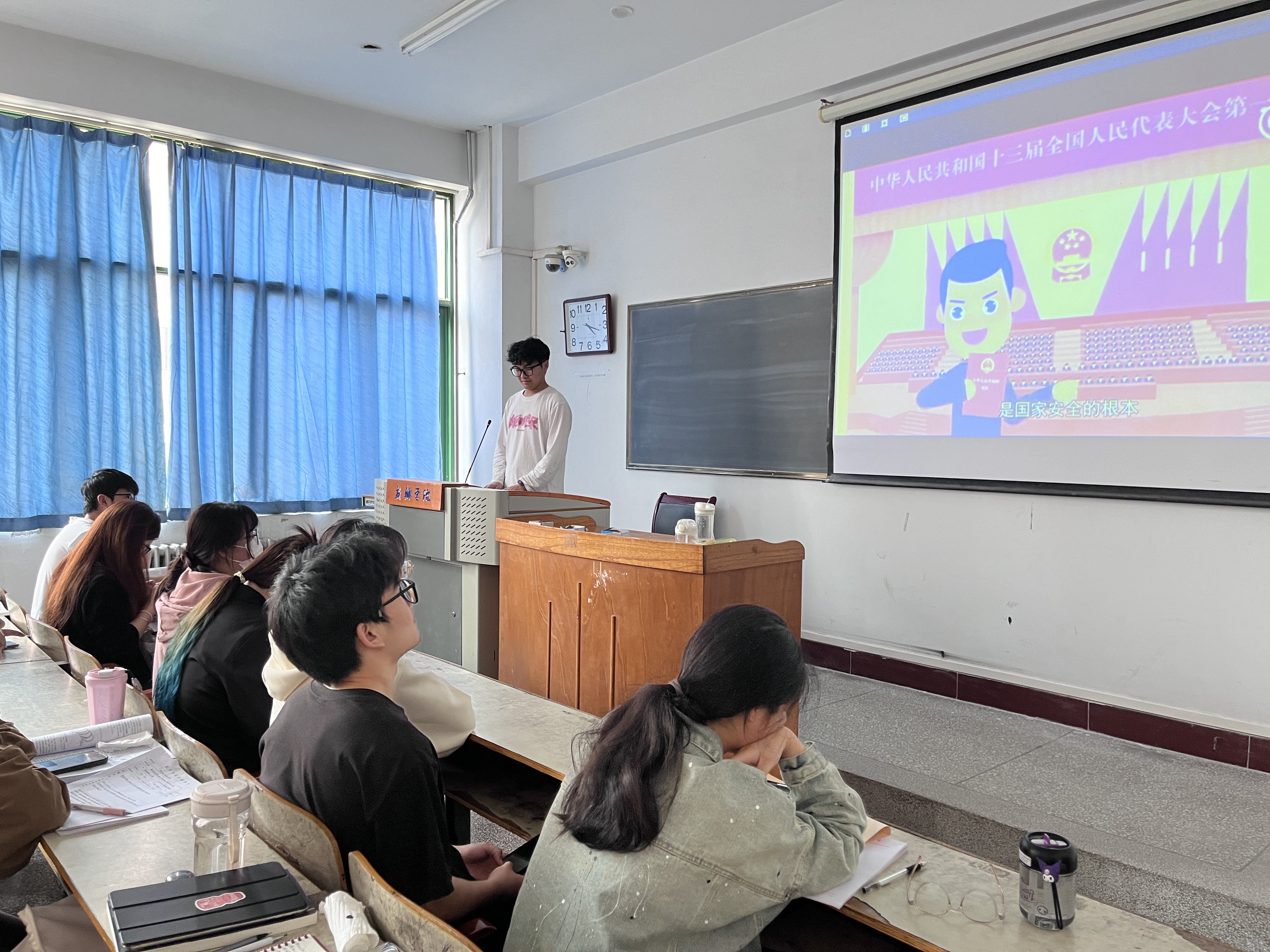 曾圆棋介绍了全民国家安全教育日的设立背景和意义,鼓励同学们要时刻保持警惕,增强自我保护意识,为国家的安全稳定贡献自己的力量。组织同学们观看了一系列国家安全教育相关视频,深入了解了国家安全法律法规、网络安全知识、防范恐怖袭击等内容。在主题发言环节,同学们积极踊跃,纷纷表达了自己对国家安全的理解和认识。崔文宣同学从个人角度出发,谈到了如何在日常生活中践行国家安全观,比如保守国家秘密、防范网络攻击等。宋博做总结发言。他强调,同学们要增强国家安全意识,并学会如何在日常生活中践行国家安全观,他希望同学们能够将所学所得转化为实际行动,为维护国家安全贡献自己的力量。