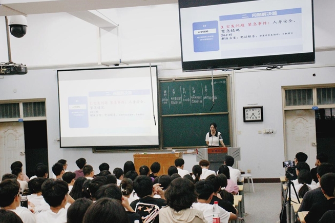 首先,李攀月根据学校相关规定,结合自身经历就如何快速适应大学生活给出建议,并就大学生活中的常见问题和困惑与同学们展开探讨。随后,李攀月阐明了高校设立资助项目工作的目的和意义,介绍了资助政策和绿色通道的概念以及军训注意事项。最后,强调有关预防校园诈骗的重要性。她指出,当前社会诈骗形式多样,需要不断提升安全防范意识,积累校园防诈知识,提高防诈能力,避免个人财物损失。