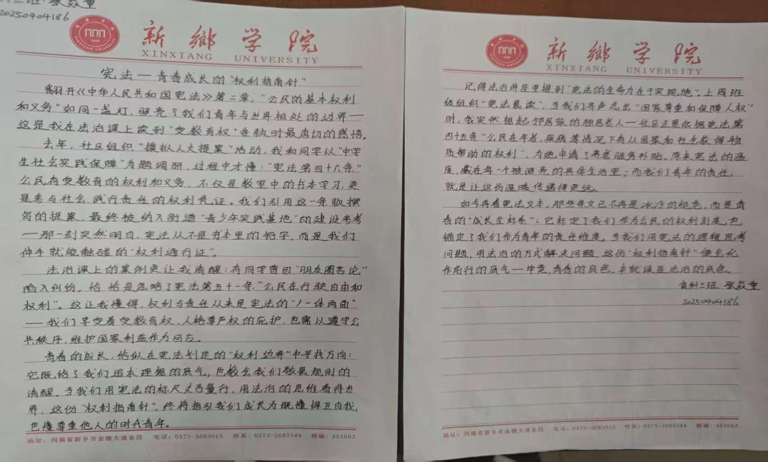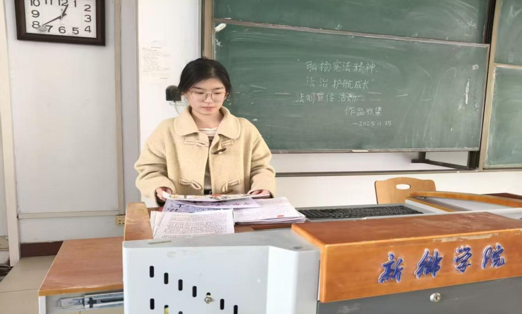 同学们在活动前期提交了法制征文、手抄报、书法等各类宣传作品,活动开始后依次进行展示并讲解相关内容。活动期间学生们积极响应、踊跃参与,围绕宪法知识、公平正义、法制精神等核心内容进行创作,将法律知识与创意表达相结合,涌现出一批主题鲜明、内容丰富、形式新颖的优秀作品。这些作品既展现了学生对法制知识的理解与认知,也体现了青年学子尊法、学法、守法、用法的良好风貌。工作人员对所有征集到的作品进行了细致整理与拍摄存档,完整记录此次活动成果。