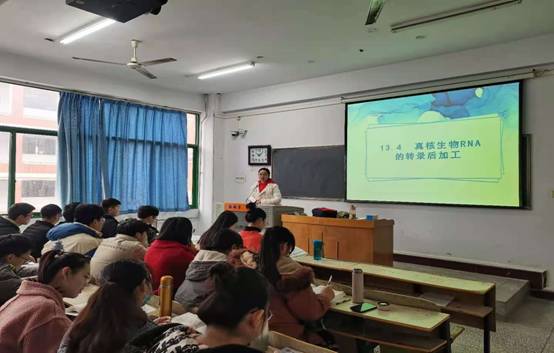 课堂上,张万方老师精神饱满,语言和教态自然。首先通过“原核生物和真核生物翻译的不同之处”这一问题导入今天所讲的主要内容:真核生物RNA的转录后加工,然后分别从RNA前体的加工步骤:5′帽子结构的形成、3′polyA尾巴的形成、内含子剪接和RNA编辑等内容依次展开,条理清晰,还能不时地结合生活中的形象实例,吸引学生的注意力,课堂秩序良好,学生听课率高,课堂时间安排恰到好处。